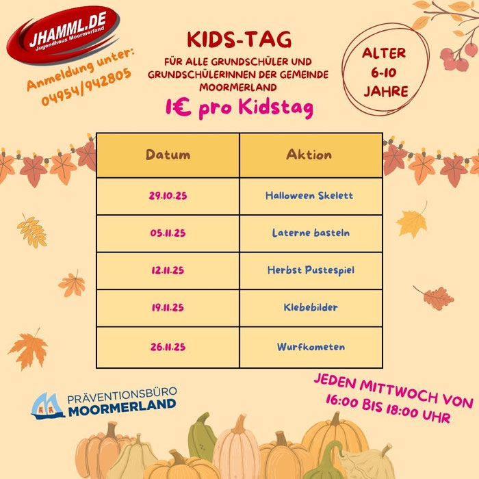 Du hast Lust auf Spaß, Action und Gemeinschaft in den Herbstferien? Dann komm mit auf unsere Jugendfreizeit zum wunderschönen Landalpark De Wedderplassen in den Niederlanden! Vom 13. bis 17. Oktober 2025 erwartet dich ein abwechslungsreiches Programm mit coolen Aktivitäten nach eurem Interesse, Spiele, und natürlich jede Menge Zeit zum Chillen mit neuen Freund*innen. Wir wohnen in einem gemütlichen Ferienhaus! Eine Anmeldung ist lediglich persönlich im Jugendhaus oder per Telefon (04954/942805) vom 15.09.25 bis zum 19.09.25 18:30 Uhr möglich. Eine Anmeldung per Mail beziehungsweise per Nachricht auf den Anrufbeantworter ist nicht möglich! Teilnehmende aus Moormerland werden bevorzugt!